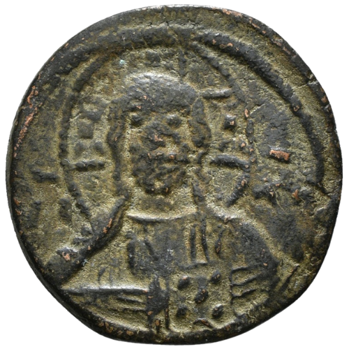 Obv: ​No legend. Bust of Christ facing, wearing nimbus cruciger, pallium and colobium, and holding book of Gospels with both hands; in field to left and right, ​ıc—xc.