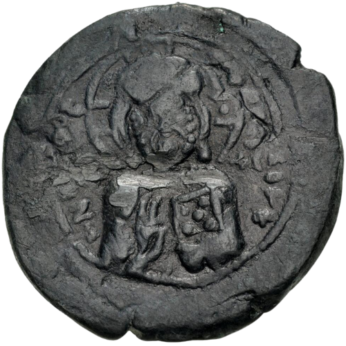 Obv: + єᴍᴍᴀɴᴏᴠʜᴧ. Three-quarter length figure of Christ Antiphonetes standing facing, wearing nimbus cruciger, pallium and colobium, and raising right hand in benediction; holding book of Gospels in left hand; in field to left and right, ​ıc—xc.