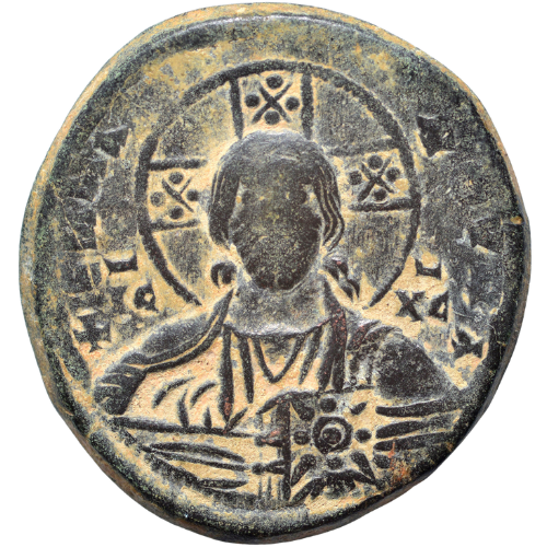 Obv: ​No legend. Bust of Christ facing, wearing nimbus cruciger, pallium and colobium, and holding book of Gospels with both hands; in field to left and right, ​ıc—xc.