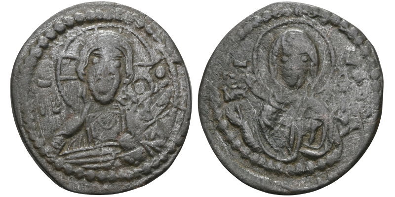 Obv: ​No legend. Bust of Christ facing, wearing nimbus cruciger, pallium and colobium, and holding book of Gospels with both hands; in field to left and right, ​ıc—xc.