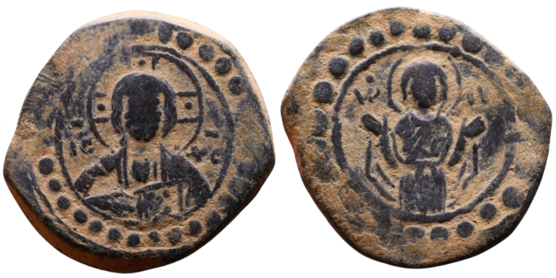 Obv: ​​​Bust of Christ facing, wearing nimbus cruciger, pallium and colobium, raising right hand in benediction, and holding book of Gospels in left; in field to left and right, ​​ıc—xc.